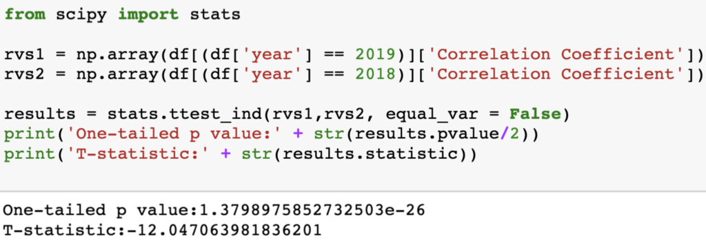 Therefore, we should reject the null hypothesis since we have a lot of evidence that suggests that the mean of correlation coefficients in 2019 is much lower than in 2018.