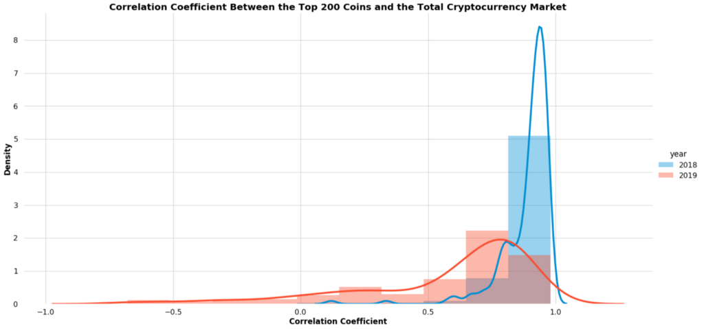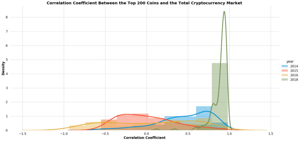 In 2018, correlations between cryptocurrencies and the total cryptocurrency market were especially high. 75% of the top 200 coins by market cap had a correlation of 0.87 or higher.