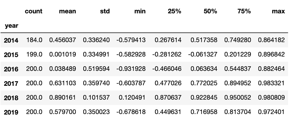 Summary statistics of correlation coefficients across the top 200 coins by market cap from 2014–2019