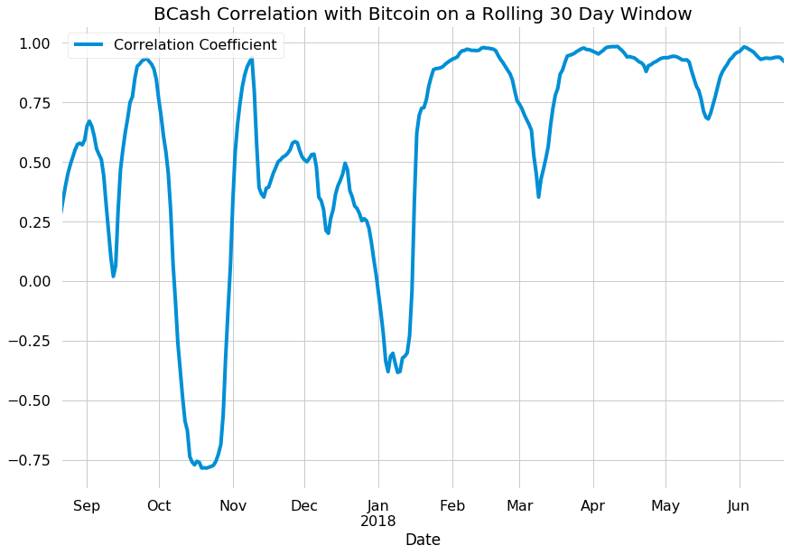 The correlation coefficient of a pair of assets changes wildly over time. Just because something was correlated a certain way in the past, does not mean the relationship will hold in the future. The 30-day rolling correlation for many coins looks like this, a series of ups and downs.