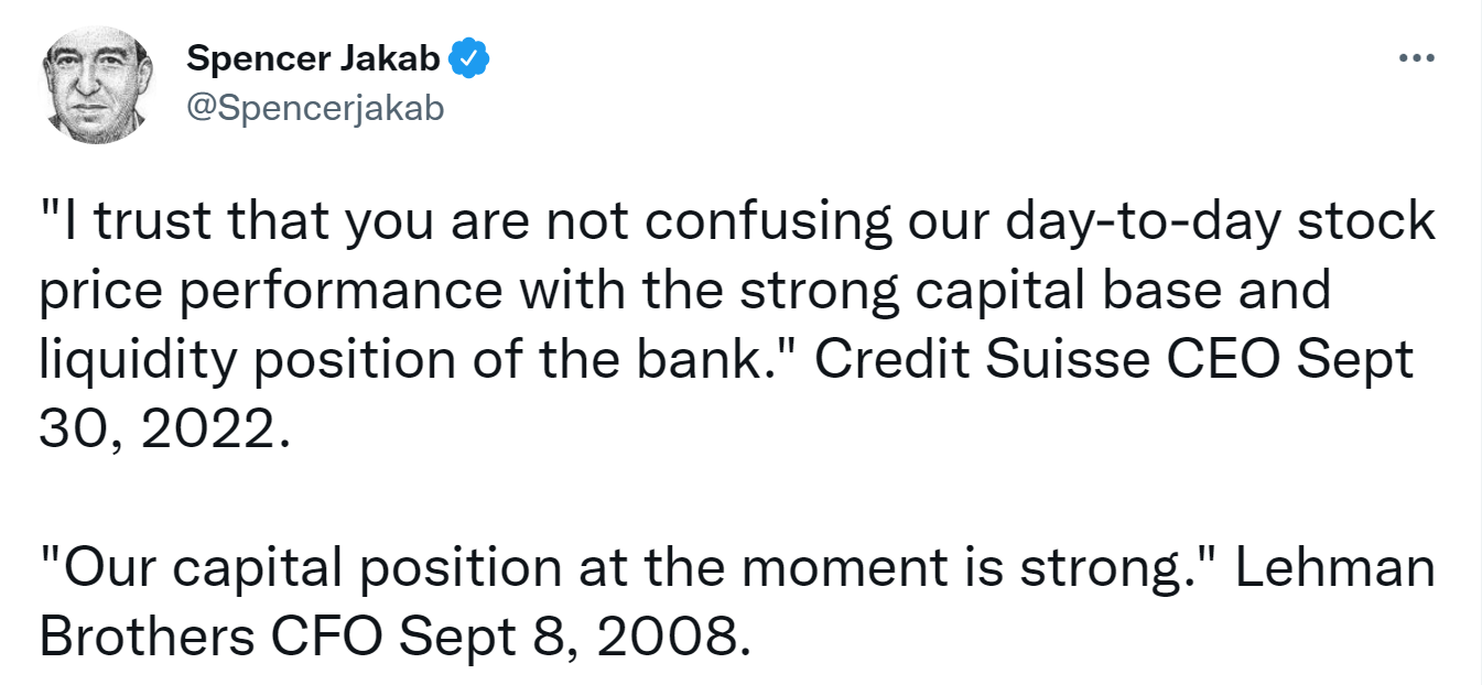“How long until other banks reduce trading and exposure to Credit Suisse as a trading counter-party? $CS Their stock price is tanking. The markets are telling us something is wrong. Now the CEO is saying this….”