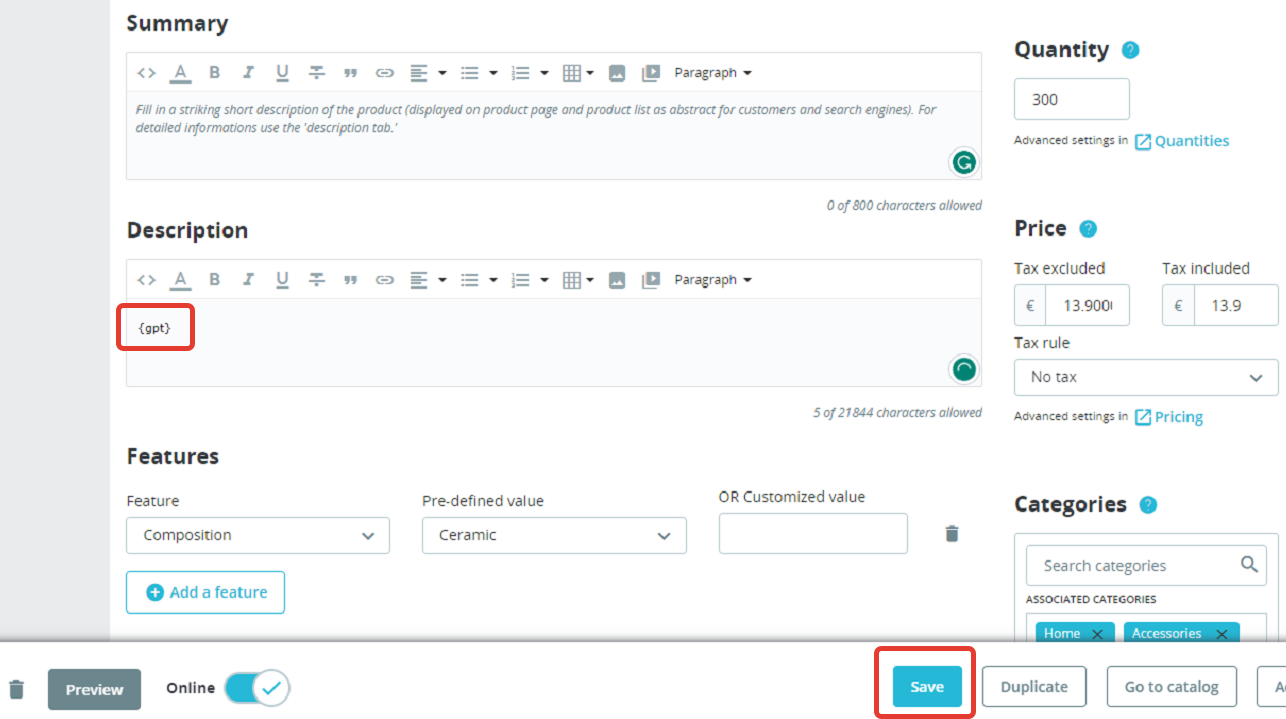 Now open our arbitrary product, enter the text {gpt} in the description field, and click on Update: