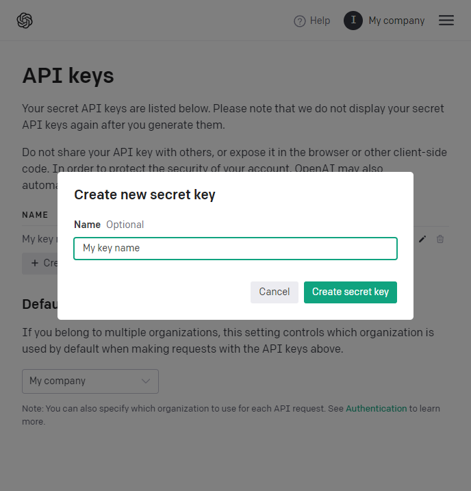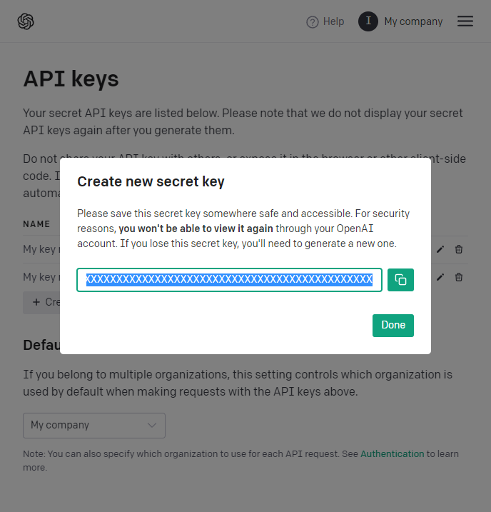 To obtain an API key, we need to go to the following link: https://platform.openai.com/account/api-keys and complete the registration process. After registration, you need to create a new API key and save it. We will specify this key in the settings of our future module.