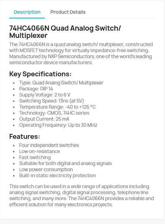<h1 id="product-title">74HC4066N Quad Bilateral Switch IC</h1>