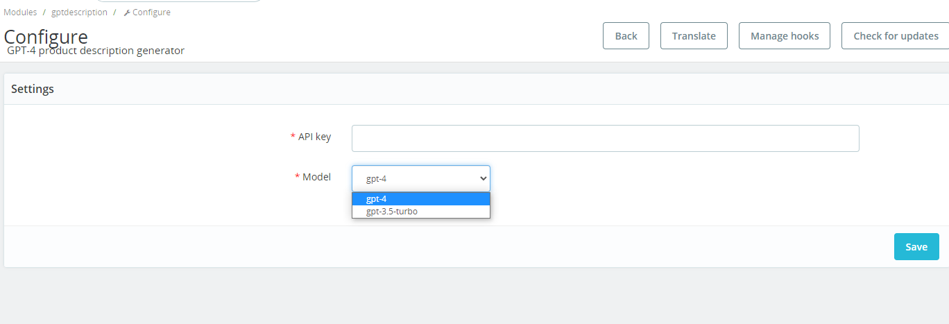 Now, after installing the module, we go to its settings and enter our API key. If you don't have access to the GPT-4 model, then switch the model to GPT-3.5. It is also capable of generating product descriptions, but it does it less effectively. Sometimes it adds nonexistent facts, and even if the model is not familiar with a particular product, it still tries to come up with a description for it, which may not be acceptable in our task.