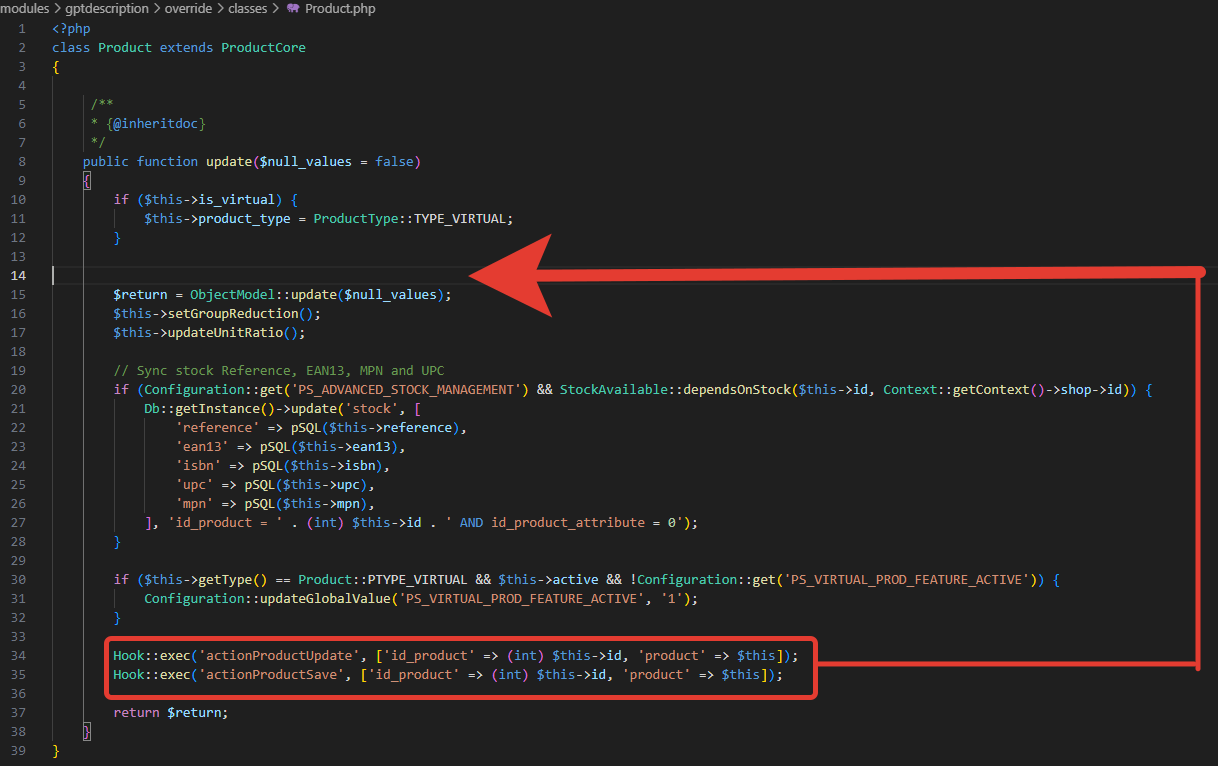 Our module is almost ready; we just need to make a small adjustment. I'm not sure about other versions of PrestaShop, but in version 8.0.3, the hook hookActionProductUpdate is called in the Product->update() method after saving the product. Therefore, our changes will not be saved. Hence, we need to create a directory in our module called override/classes. In this directory, create a file named Product.php and override the update() method. In this method, we need to place the hook calls before saving the product.