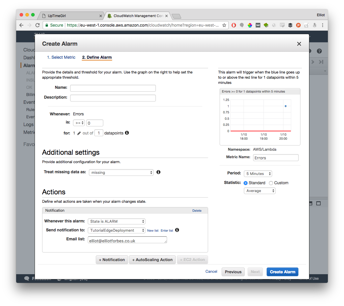 If we wanted our system to notify us for any error then we could do this one of two different ways. We could either extend our Lambda function and add the code necessary for it to publish to an SNS topic or we could set up an alert on CloudWatch whenever an error is reported by one of our Lambda functions throws an error.