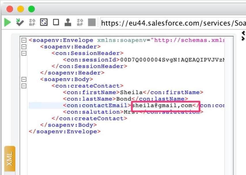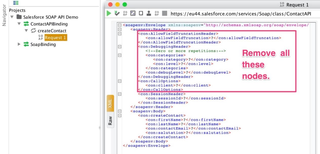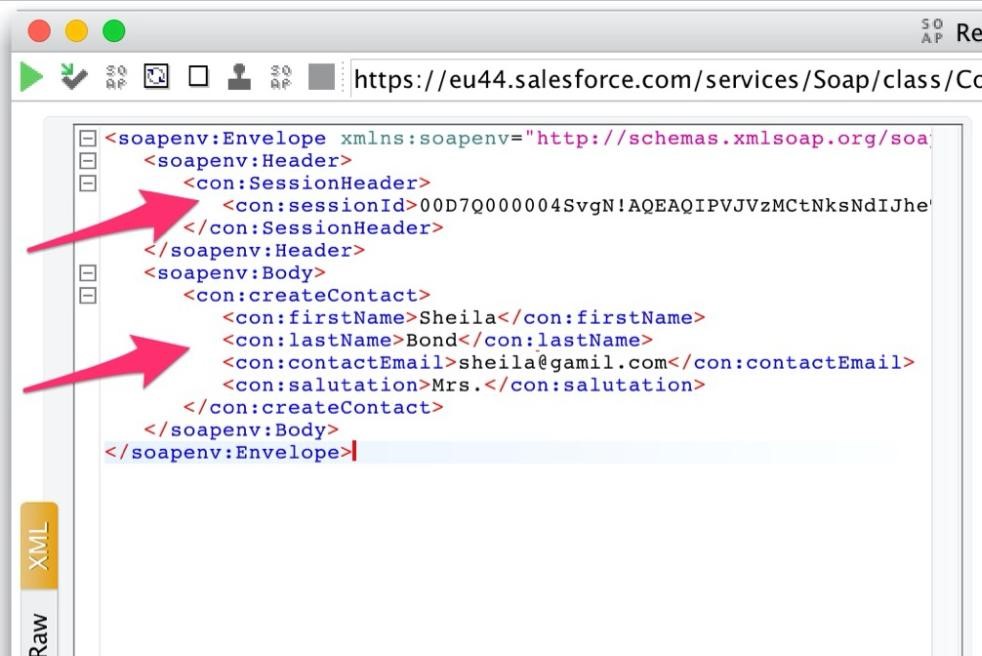 After removing the unwanted nodes, we provide the sessionId that we copied from our login call earlier. Then, in the Body section of the envelope, we provide the details of the contact to be created.