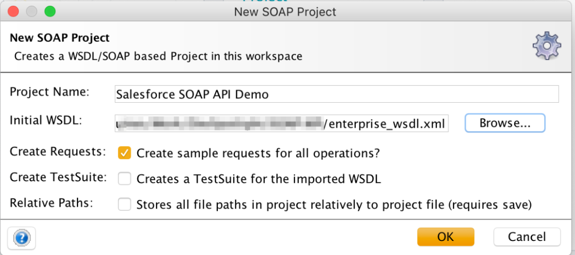 For the purpose of this demo, we’ll use SoapUI, which is an open-source tool to test SOAP (and other protocols) web services. With SoapUI installed and running, we create a new SOAP Project, providing a name and selecting our enterprise_wsdl.xml file as the initial WSDL.