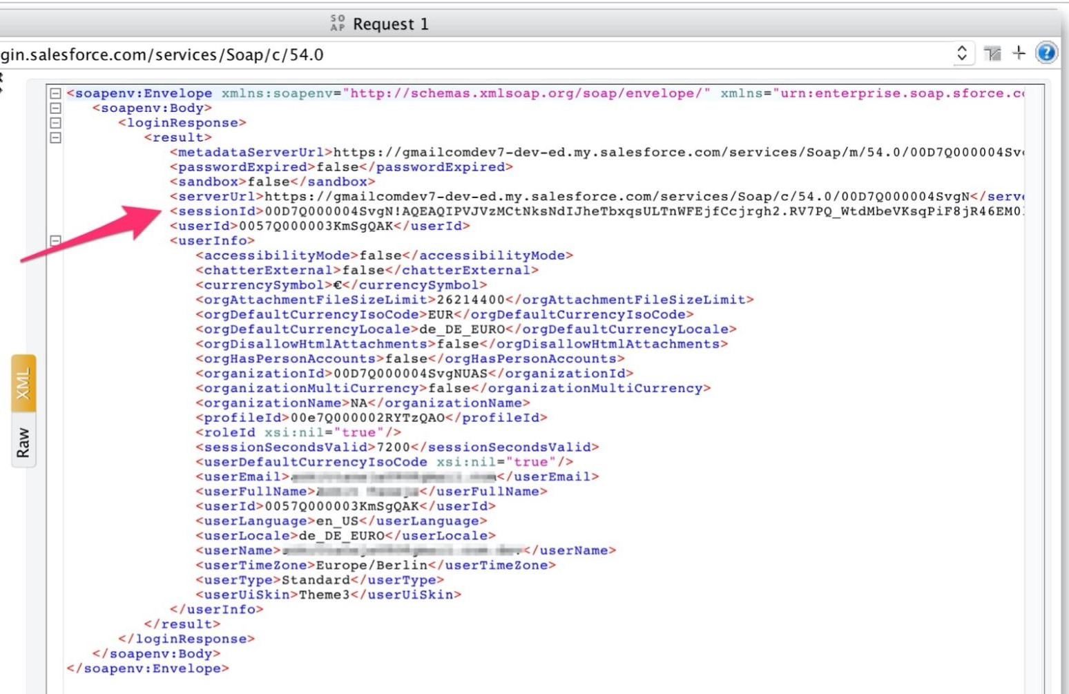The critical pieces that we are looking for in the response are sessionId and serverUrl. In order to call our web service, we need to provide the sessionId together with other parameters in our call. We copy down this sessionId, as we will need this later.