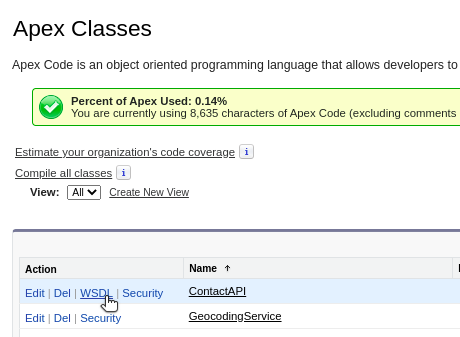 After creating our ContactAPI class, we see it show up in the list of Apex classes. In the row for ContactAPI, we click on the WSDL link to generate a WSDL.