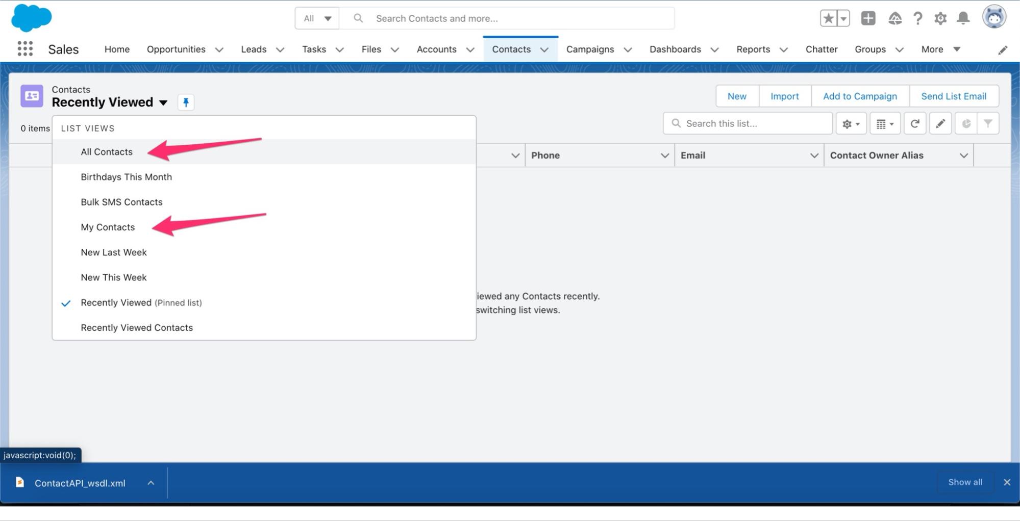 By default, we land on the Contacts page with the Recently Viewed Contacts list view. Click the down arrow and select either All Contacts or My Contacts list view.