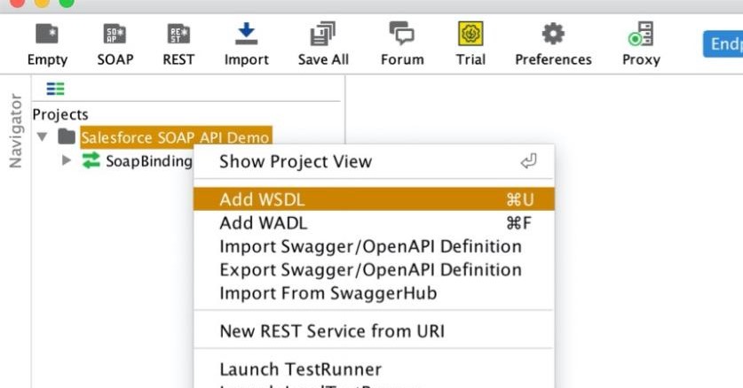 Let’s call our ContactAPI class and create a Contact in Salesforce. To do this, we need to add our ContactAPI WSDL file, contactAPI-wsdl.xml, to our project. We right-click on the project folder and select Add WSDL.