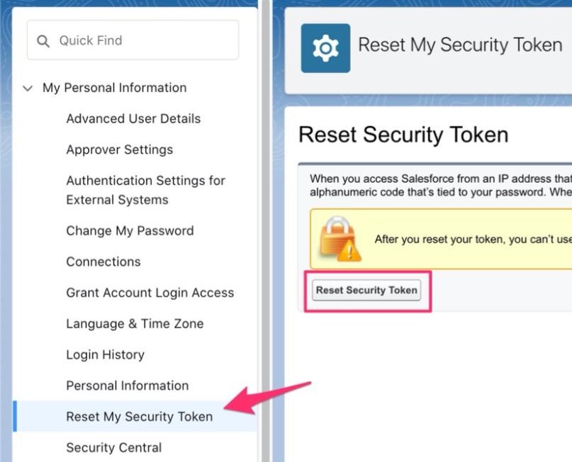 For added security, we also need to add a Security Token to our password to authenticate. We can get a security token by going to the Settings page and selecting Reset My Security Token on the left. Then, press the button with the same name. We will then receive our security token by email.
