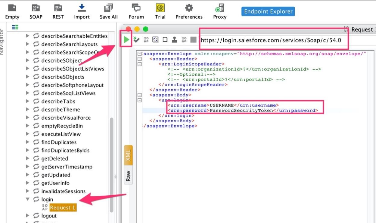 With our token in hand, we select the login SoapBinding in SoapUI. Ensure you have the correct URL depending on your org. If you just signed up for a developer account, the URL should be https://login.salesforce.com. If you are testing this in a Sandbox, then the URL should be https://test.salesforce.com. Ideally, the generated Enterprise WSDL will already have the correct URL.
