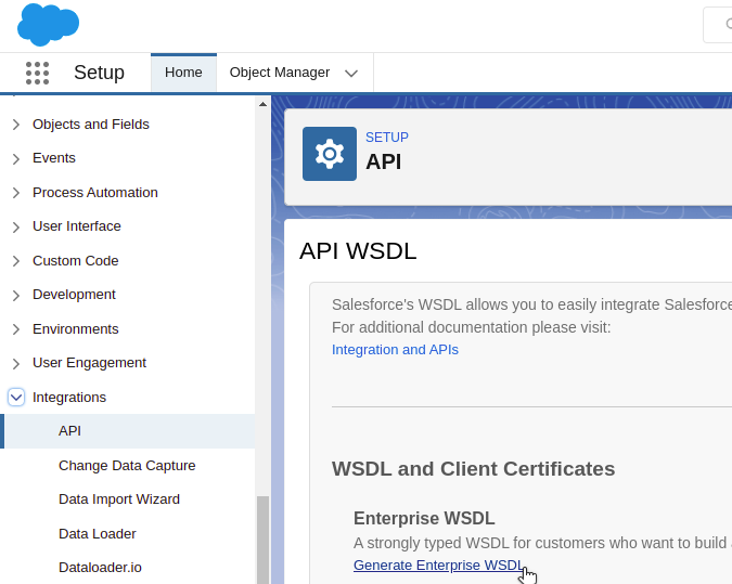 To generate the Enterprise WSDL for our Salesforce org, we go to the Setup page, and then find Integrations -> API. Then, we click on Generate Enterprise WSDL.