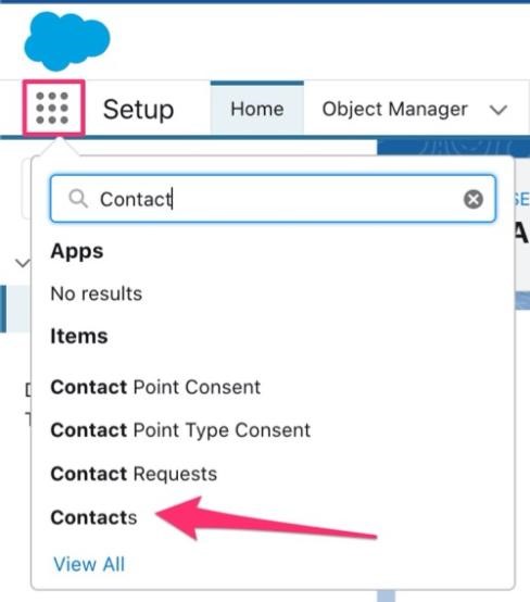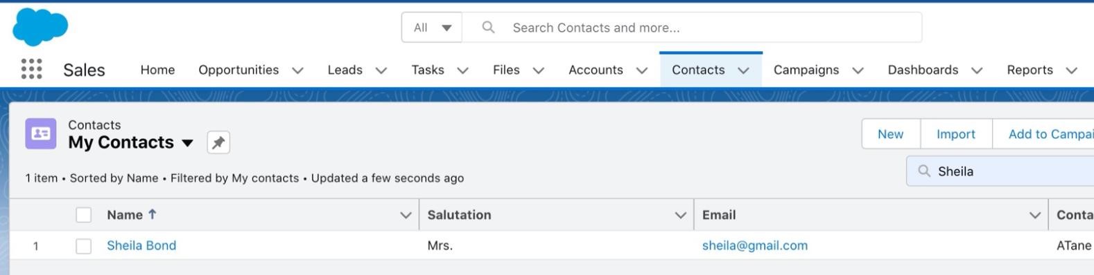 Let’s look inside our Salesforce org to see if everything was created correctly. We go to our Salesforce org, click the App Launcher waffle icon on the left and then type Contact in the search bar to find and select Contacts.