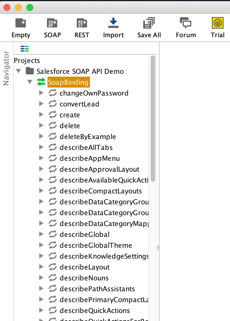 After adding the WSDL, it also appears in the left menu like below. Double-click on Request 1 to see the request. For this example, we can remove everything from the SOAP envelope header except for the SessionHeader with sessionId node.