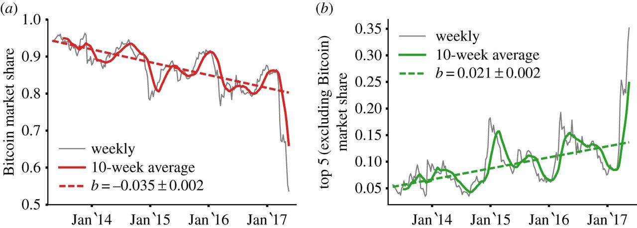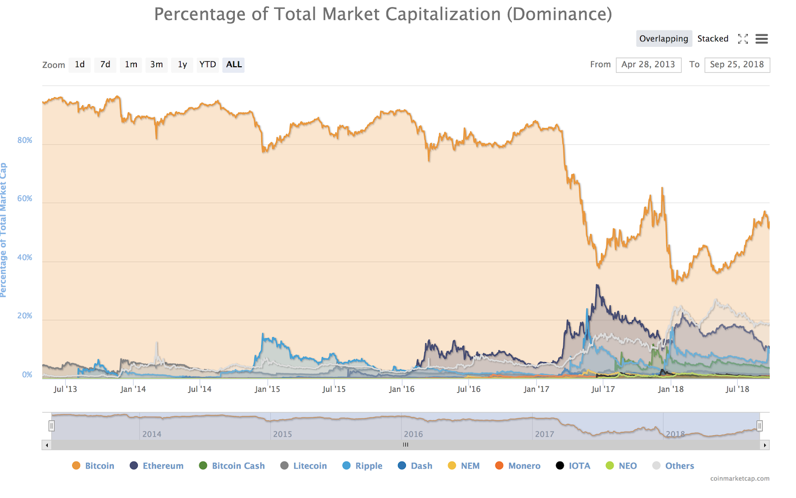 Since January 1st 2017, Bitcoin’s market cap has fallen from 85% to 50%. While still demonstrating 62% net positive growth.