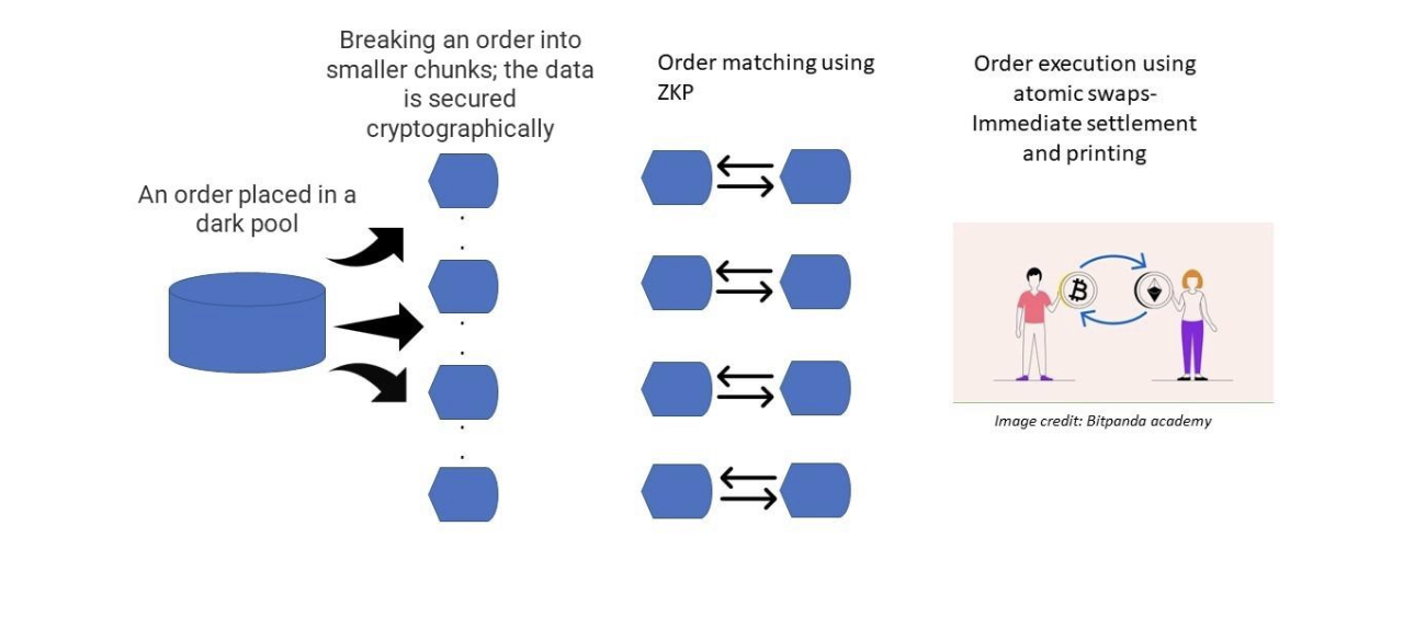 Here is how a decentralized crypto dark pool works schematically: