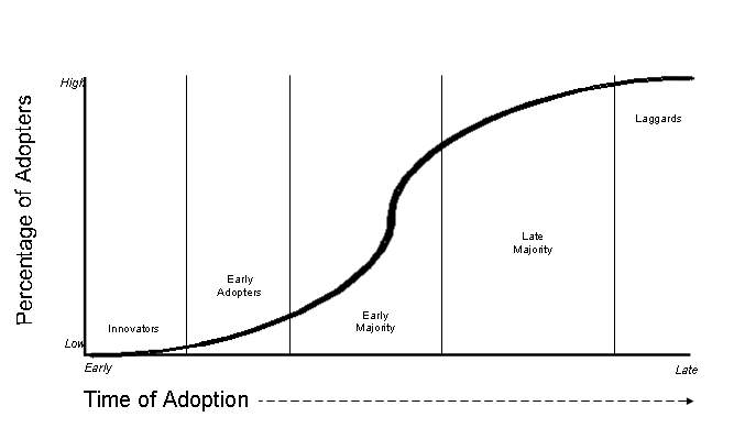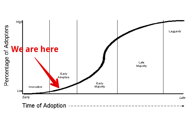 For you non-nerdy people, let me translate. With adoption of a new thing, there is very slow growth at the beginning, but then it accelerates and shoots up almost vertically before leveling off. Value of the thing being adopted closely follows this pattern. It shoots up rapidly just as the mainstream is getting in, but after the early adopters have gotten in. This is why early adopters are able to realize the biggest gains.