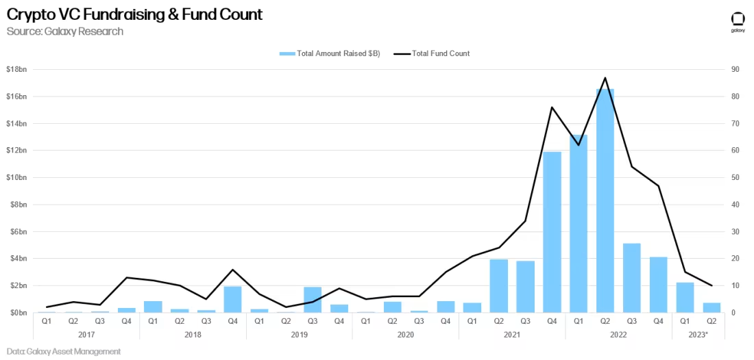 Evidently, crypto VCs have not invested a lot of funds into the market this year. This is due to a sharp decline in the amount of newly injected capital and new funds. Data from Galaxy Asset Management reveals that the number of new funds in Q2 2023 was only 10, with the total amount raised falling below $1 billion.