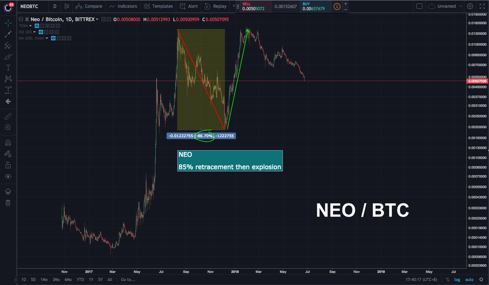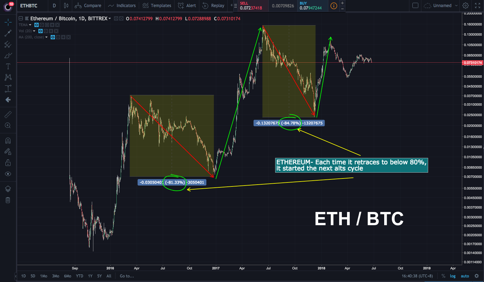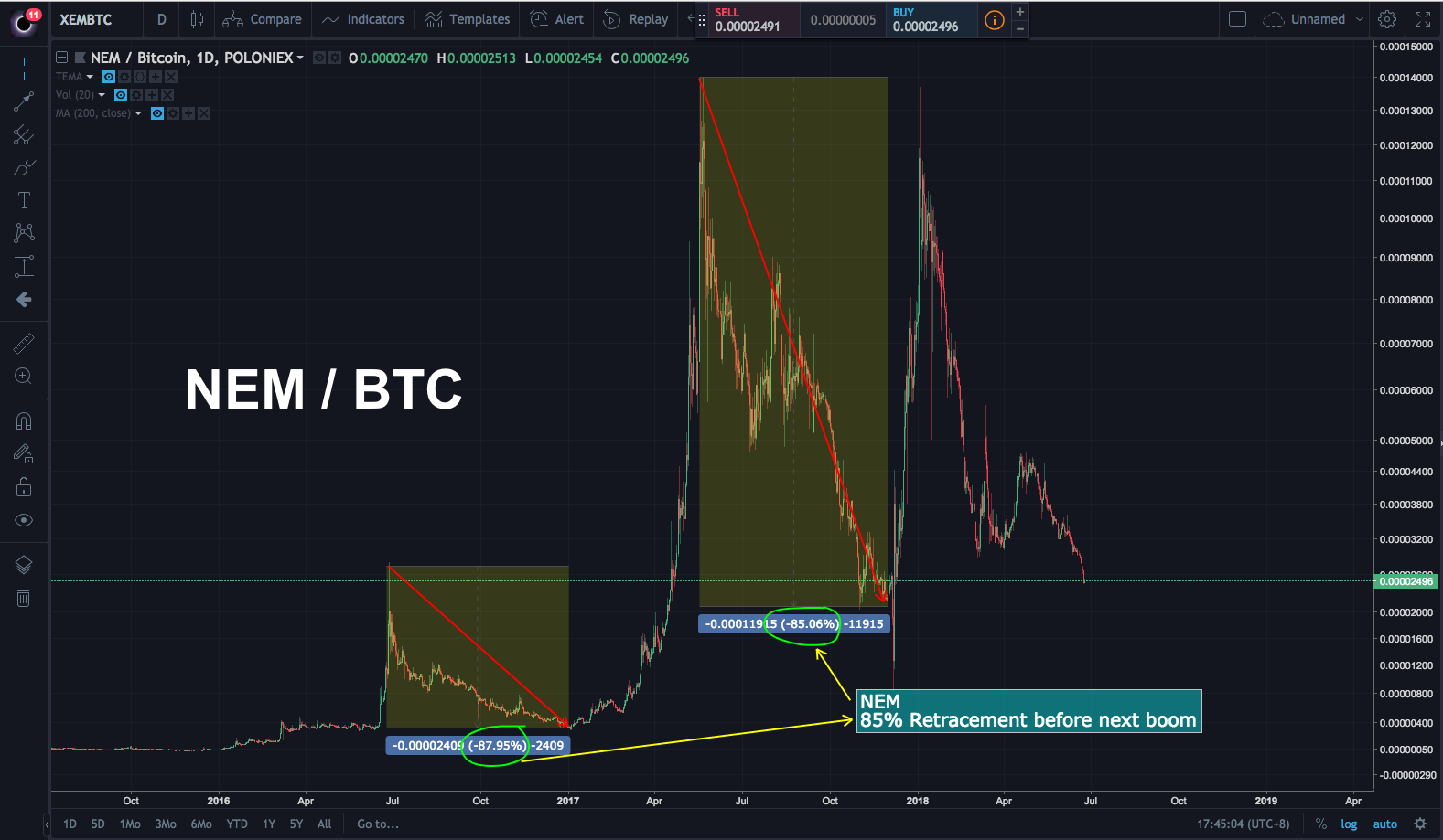 - Stop exposing my capital to the market unless the coins have retraced down to 85% in BTC or USD value.
