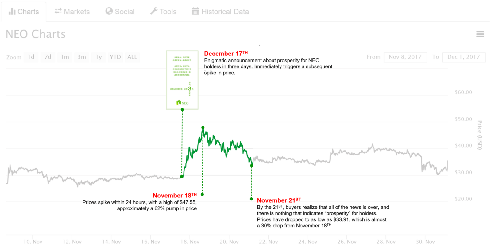 Back in December 17TH, 2017, NEO Council published an image that went viral immediately. The image, written in Chinese, prophesied prosperity for NEO holders in three-days’ time frame. With little other information to go on, craze ensued. Conspiracy theories crept out from all corners of the Internet, many of which had to do with the Chinese government’s cooperation with NEO as the gatekeeper for legalizing ICOs in China. Within a 24-hour period from the announcement, the price pumped by 62%.
