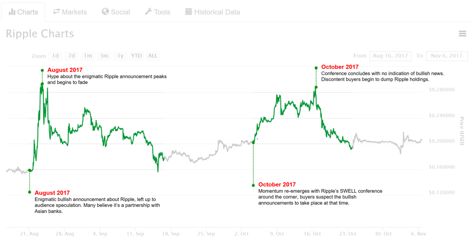 Similarly, Ripple unveiled an announcement about upcoming announcements in August of 2017. In a similar fashion, the market frenzied with speculation of bullish activity, which then drove up the prices. Prices trickled from that point, and revitalized for an extended period of time in October, as users began to hypothesize that the bullish announcements would be appropriately revealed at Ripple’s upcoming conference, SWELL. That didn’t happen, and Ripple prices dropped again.