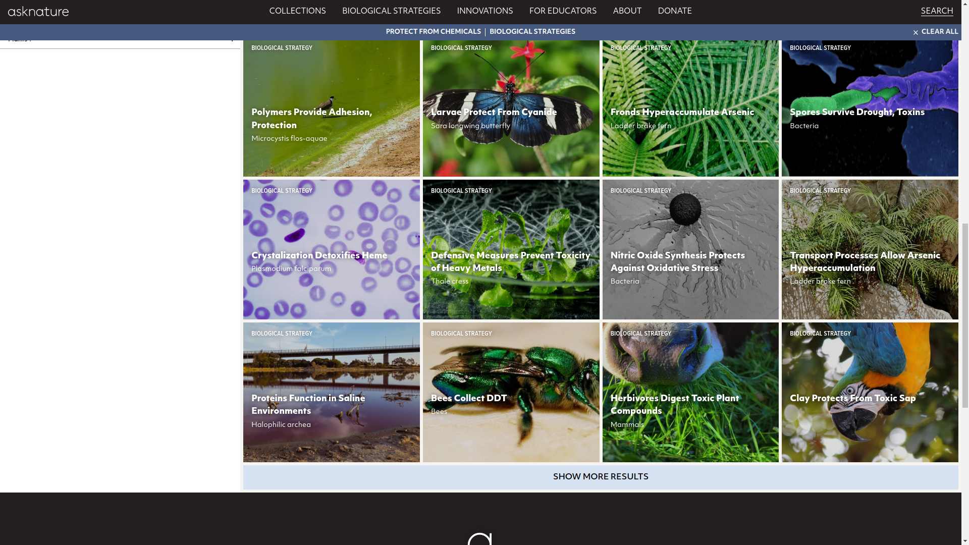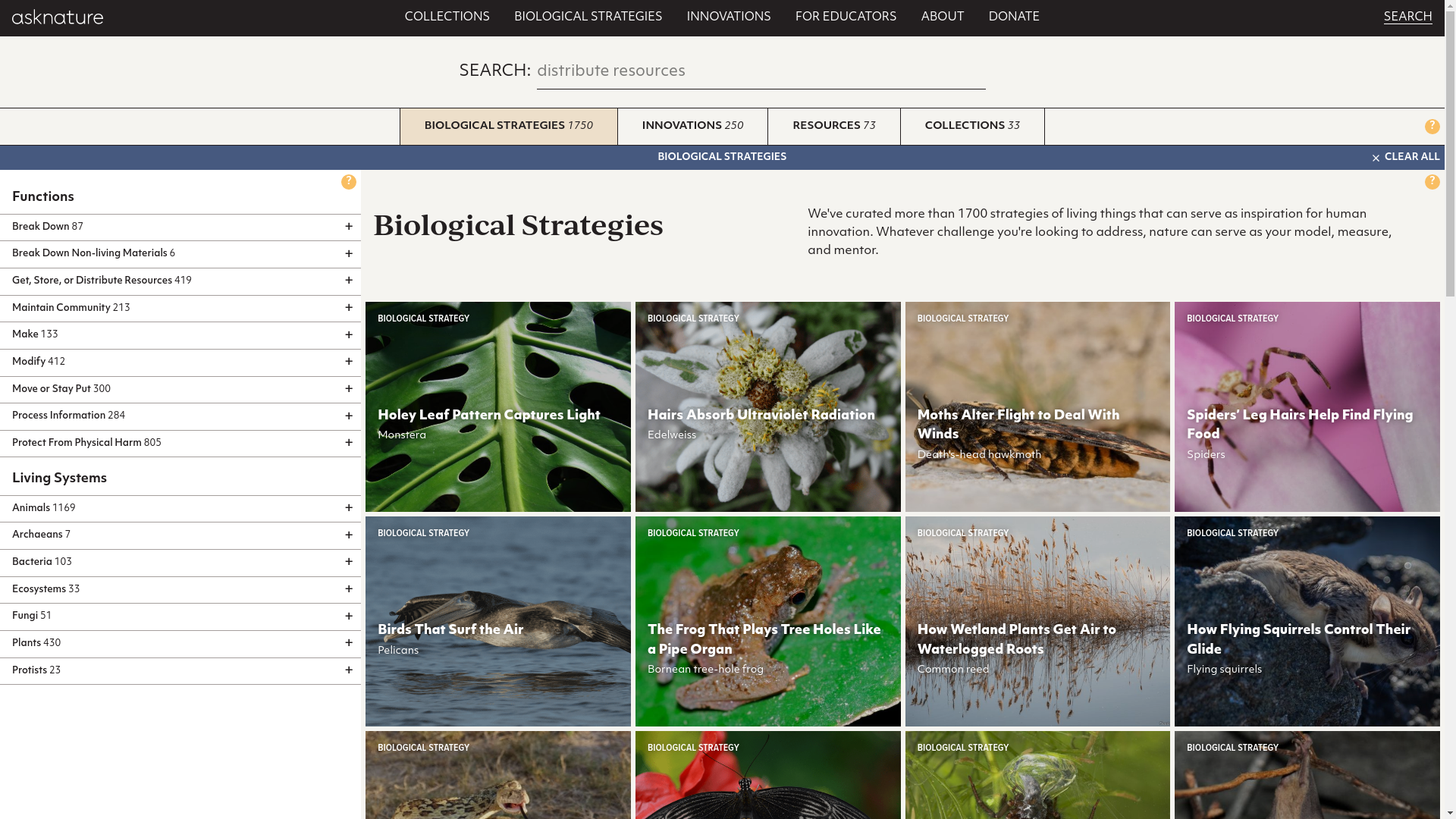 This step focuses on research and information gathering. It is about searching for biological models (organisms and ecosystems) and strategies needed to solve specific design problems. This is where AskNature comes into play. Let's visit AskNature website and click on "BIOLOGICAL STRATEGIES" (top center). Then we need to click "SEARCH STRATEGIES" (center). The web page we got is where we can search for strategies now: