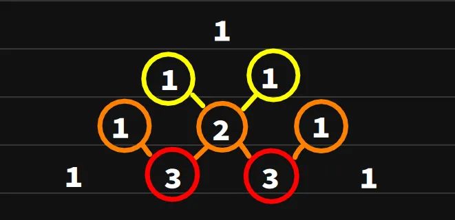 1.For each subsequent row, each element is the sum of the numbers directly above it, on either side.