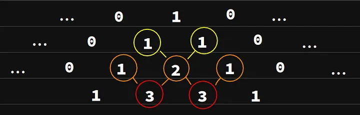 How come every line starts and ends with 1 then? To explain this we can imagine that where no element is present in the previous line, we count that as a 0. Then, if the 0 is on the left, we’ll have a starting 1, and where the 0 is on the right we’ll have a trailing 1.