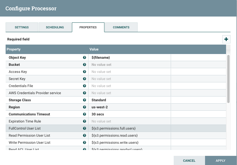 For this, we need to use NiFi processor PutS3Object. In it, we have to configure our AWS credentials, bucket name, and path, etc.