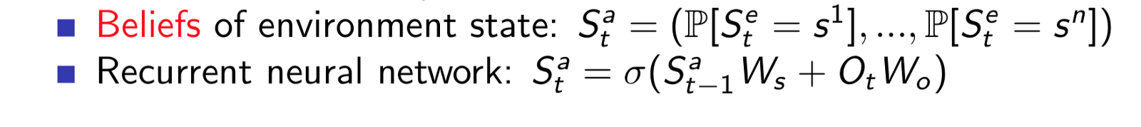 - Partially Observable Environment: Agent observes environment indirectly. In this case, agent state != Environment State. This is known as Partially Observable MDP (POMDP). Possible agent state representations: