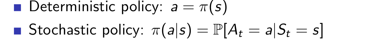 - Deterministic Policy: a = F(S). We want to learn this policy from experience and we want to maximise the reward via it.
