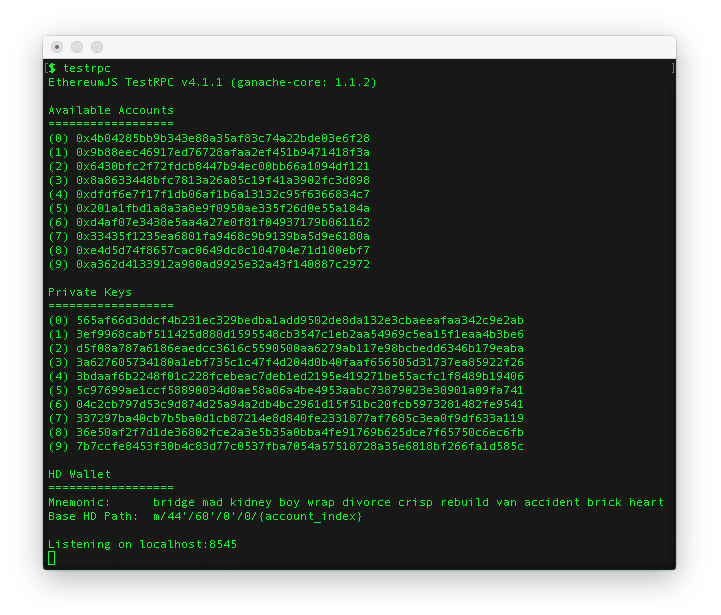 1. Kickstart our test client with testrpc. You’ll see some of the accounts you’ll be using to simulate the interaction: