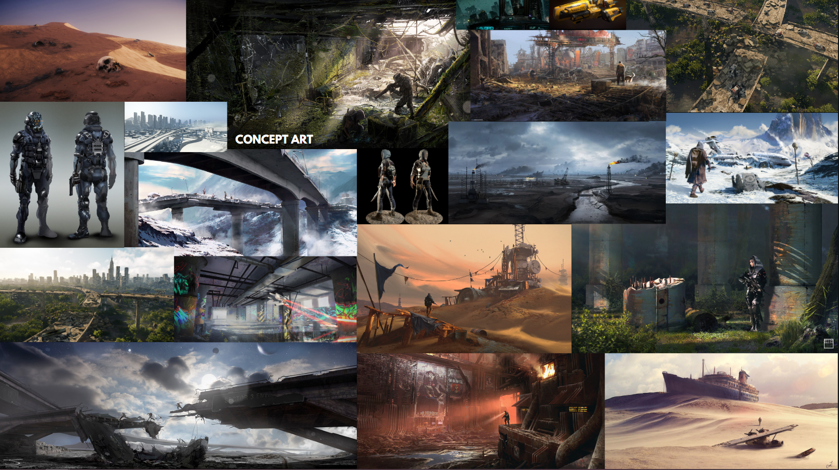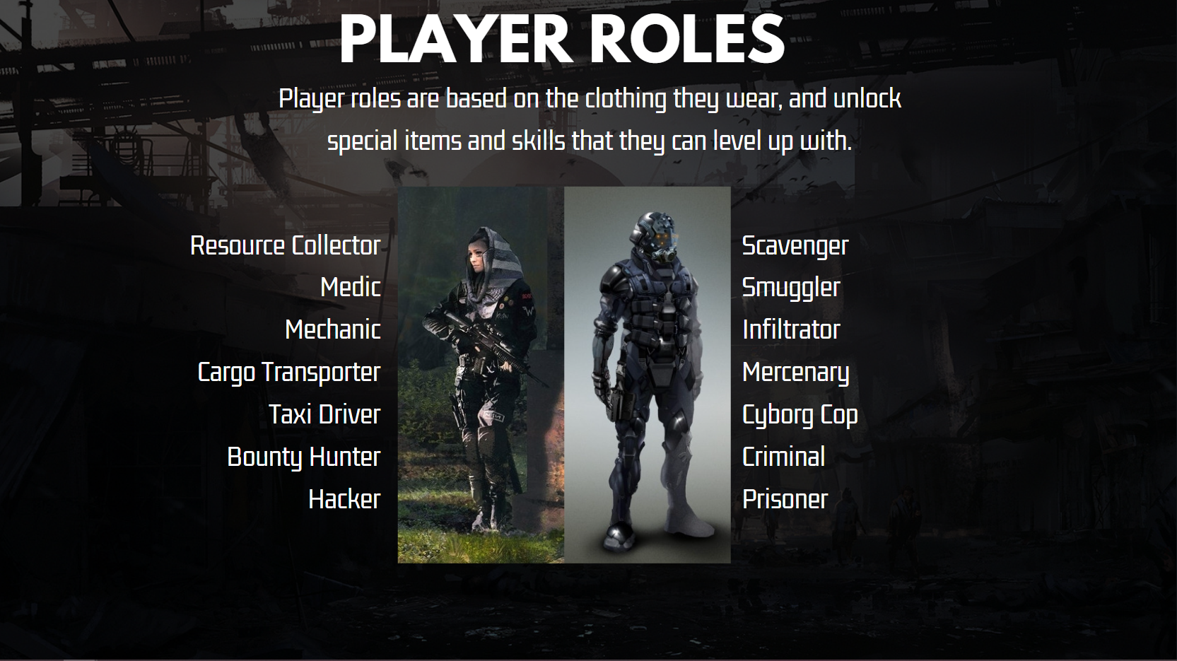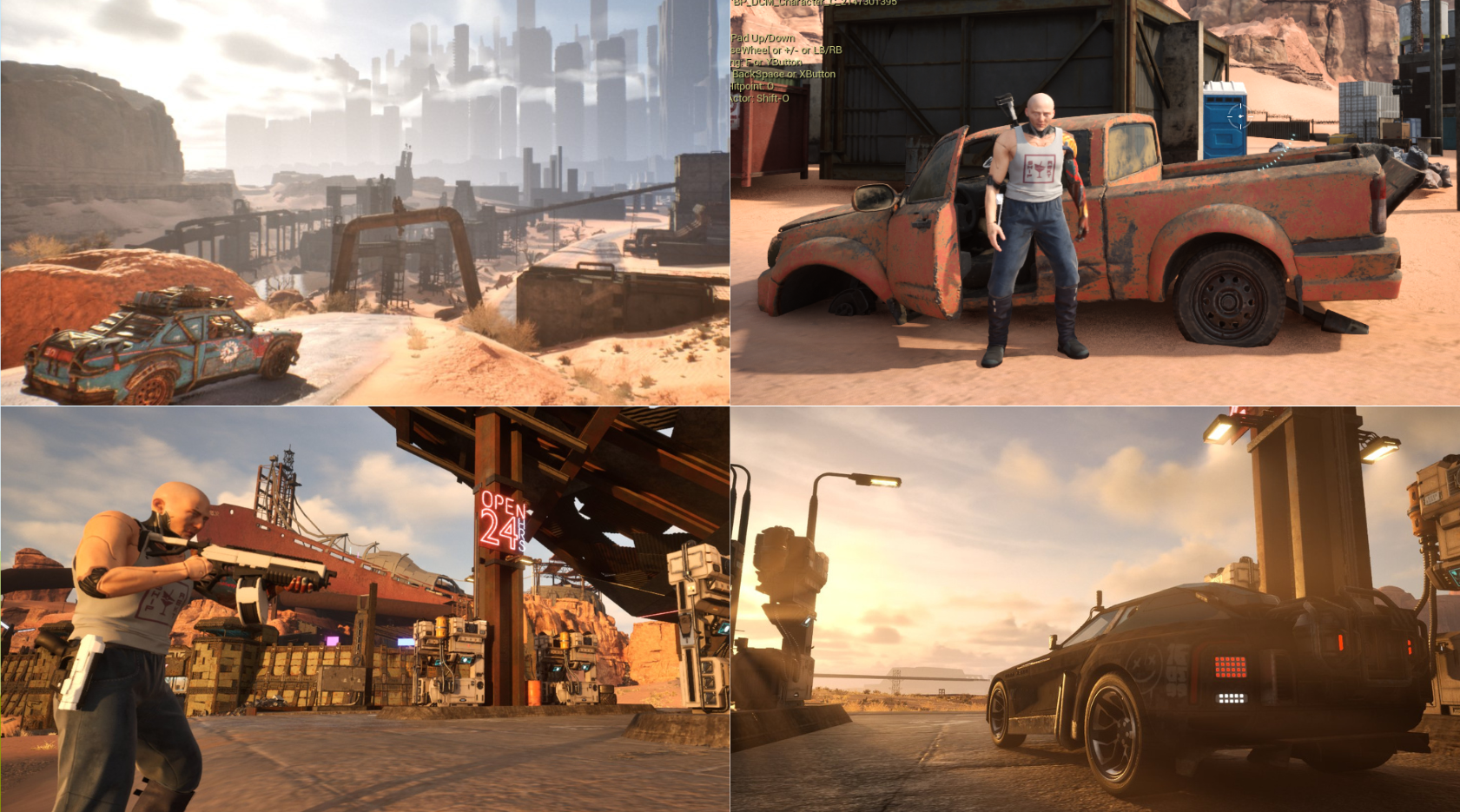 Online environments will include crumbling cities, deserts, abandoned areas, caves, and safe zones protected by police cyborgs. Players will be able to freely explore and loot this vast area, trade, construct buildings, or complete missions that appear randomly on the map.