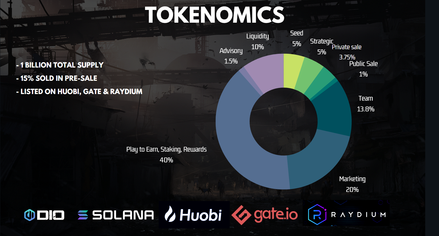 Our currency is to act as the main means of exchange inside the Decimated videogame, and it will give value to all other items in the game. The total supply of the token is 1,000,000,000. The maximum supply of DIO Tokens has been minted in a single genesis block.