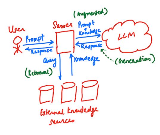 As shown in the diagram above, based on the prompt provided by the user, the server system could fabricate a query that it believes would enhance the quality of the response provided by the LLM. To do so, it could query external knowledge sources (outside of the training data of the LLM) like: