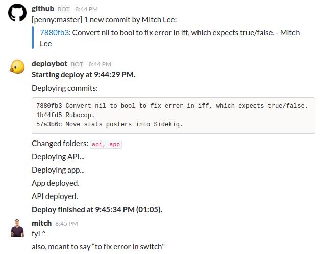 This integration is primitive and a little hacky, but it does what we need it to do. As a two-person team, we’re hungry for effort-amplifying tools like this one that ease our work and move more quickly. Not to mention that you can deploy from your phone, which has saved us a few times already. If you’re interested in what we’re deploying, pop over here to take a look :)