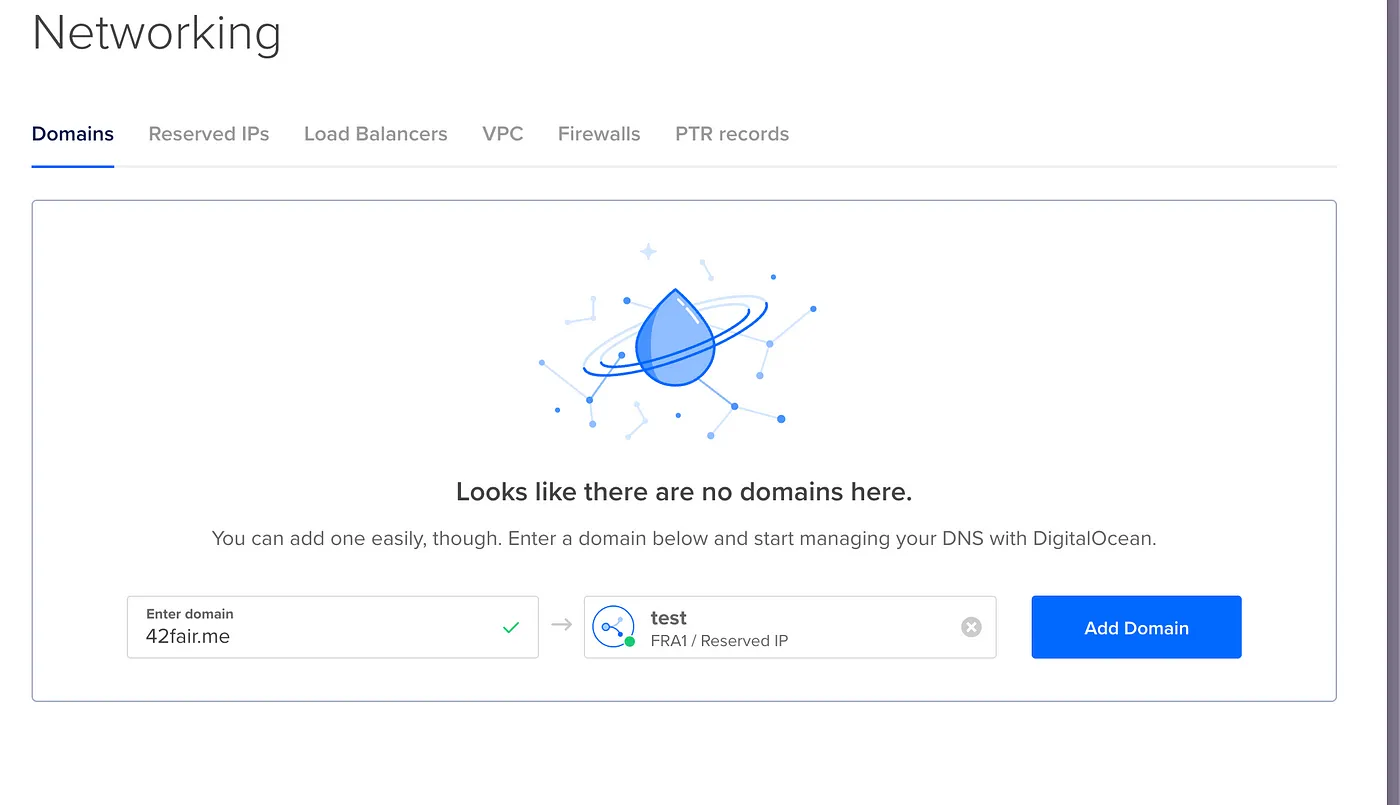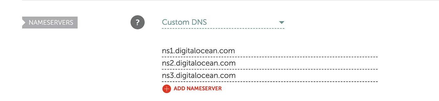 When you insert the domain name and click “Add Domain,” you need to point to DigitalOcean in your nameservers. You can follow the guide from DigitalOcean using this
