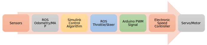 I initially opted to use the open source VESC over the standard RC ESC because the standard RC ESC did not have robust throttle control at low speeds. Even the VESC was problematic at first because it needed a disarming sequence for the pulse width modulation(pwm) signals. A for-loop going through a wide range of pwm signals was used to find the disarming sequence. The pwm signals were sent from the Matlab Simulink control model into ROS, into the Arduino Uno, and finally into the VESC. In the end however, I used programmable RC ESCs (Tekin RX8 v2.0) because both of the VESCs fried. (Apparently the VESCs have a really fry-able DRM chip from Texas Instruments.) Instead of a electrical solution, I went for a mechanical solution by using a lower pinion gear (11T). To explain things in simpler terms, I created a small pipeline illustration below.