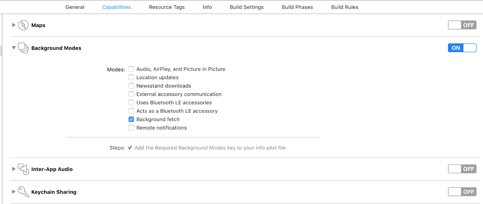 To have the layout update while the app is suspended, we need to enable the ‘Background Fetch’ capability. To enable this, open your project settings > Capabilities and toggle ‘Background Modes’. From the modes that are revealed, enable ‘Background Fetch’.