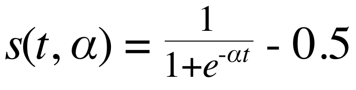 Equation 1: An instrumented sigmoid centered at x = 0. α is our knob to tune the steepness, and t is our animation progression from 0 to 1.