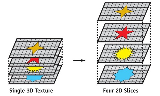 - 3D texture with each slice stored in a separate 2D texture