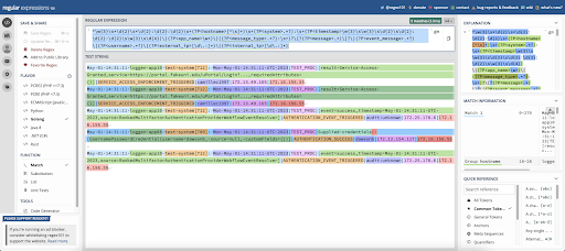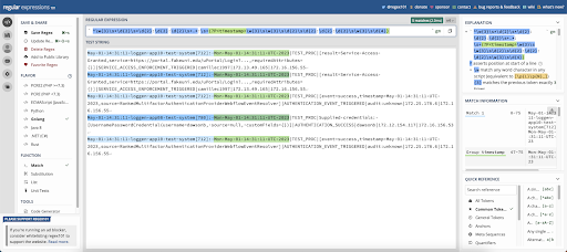 We’ve named this capture group “timestamp”. It contains the same basic regex as the other timestamp, with the addition of “\w{3}\s” at the start to capture the abbreviated day of the week, and “\s\w{3}\s\d{4}” replacing the “\s+” at the end in order to capture the 3 character timezone, and the 4 digit year.