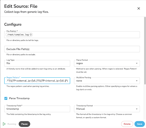 In BindPlane, I create a File source. This looks at my generated log file in /root/complex.log. I’ve selected regex under Parse Format. Under the Regex Pattern, I put in the final pattern above. I’ve checked the box for Parse Timestamp, chosen Manual for the format, and put in the time parsing codes for my timestamp’s pattern.