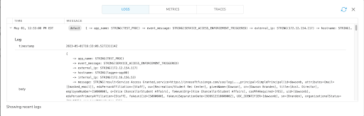 **May 01 14:31:11** loggen-app10 test-system[712]: **Mon May 01 14:31:11 UTC 2023**|TEST_PROC|[result=Service Access Granted,service=https://portal.fakeuni.edu/uPortal/Login?...,requiredAttributes={}]|SERVICE_ACCESS_ENFORCEMENT_TRIGGERED|camillec1997|172.13.49.165|172.16.156.55