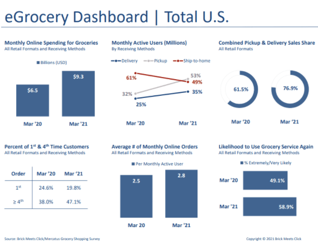 About 15.3% more U.S. citizens have used an online grocery delivery or pickup service in 2021 than in 2020, according to a March Online Grocery Shopping Survey by research advisory firm Brick Meets Click.