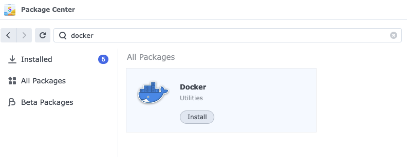 Step 2 - Open your Package Center and search for “Docker” and click “Install”.